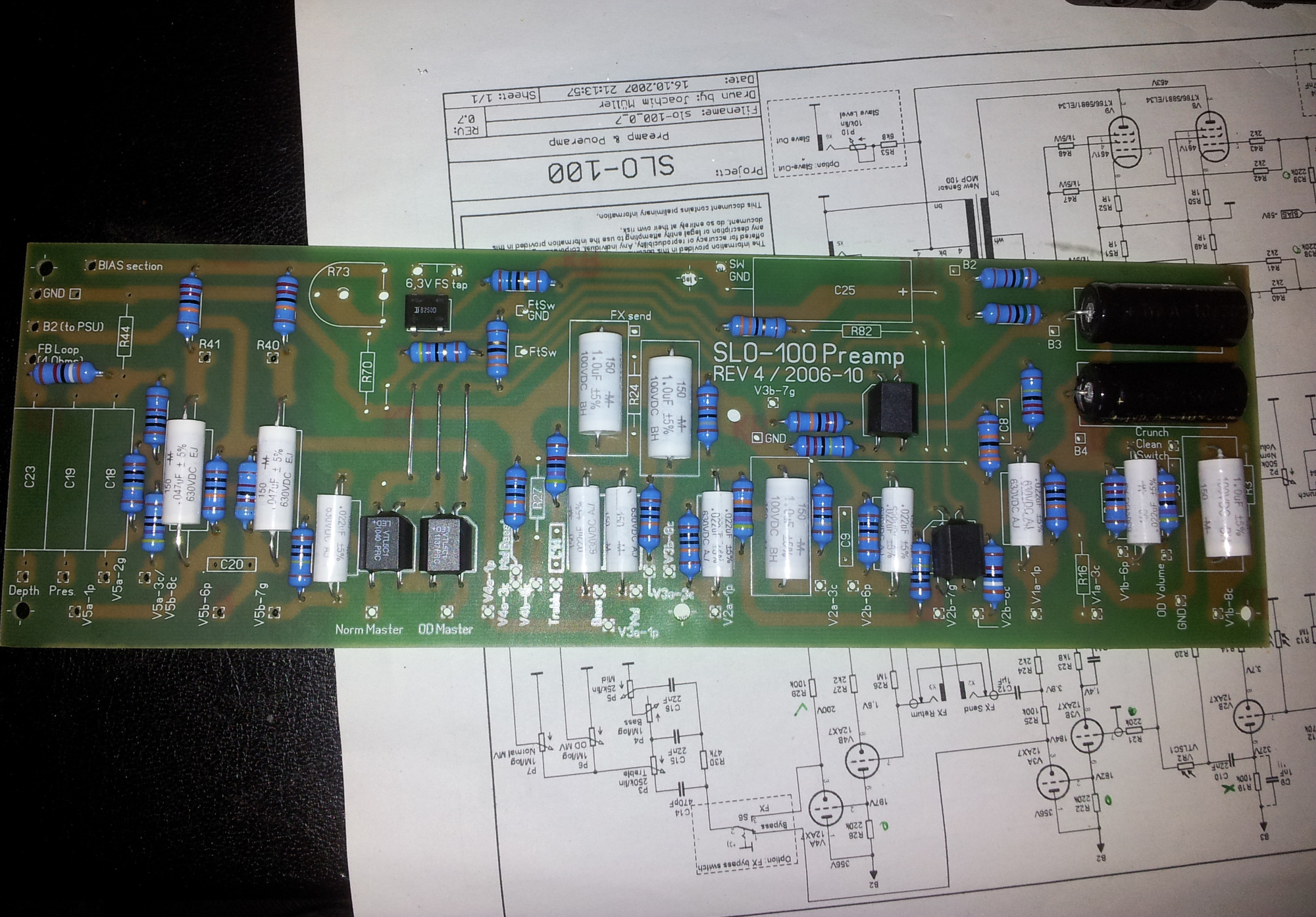 Der Aufbau erfolgte in mehreren Schritten, zunächst mussten die Platinen bestückt und gelötet werden, danach ging es an die interne Verkabelung. Abschließend sollte das Chassis natürlich in ein ansprechendes Holzgehäuse verbaut werden, hierzu habe ich einen Kunstlederbezug (Tolex) ausgewählt und schicke Lederecken als Kantenschutz angebracht.