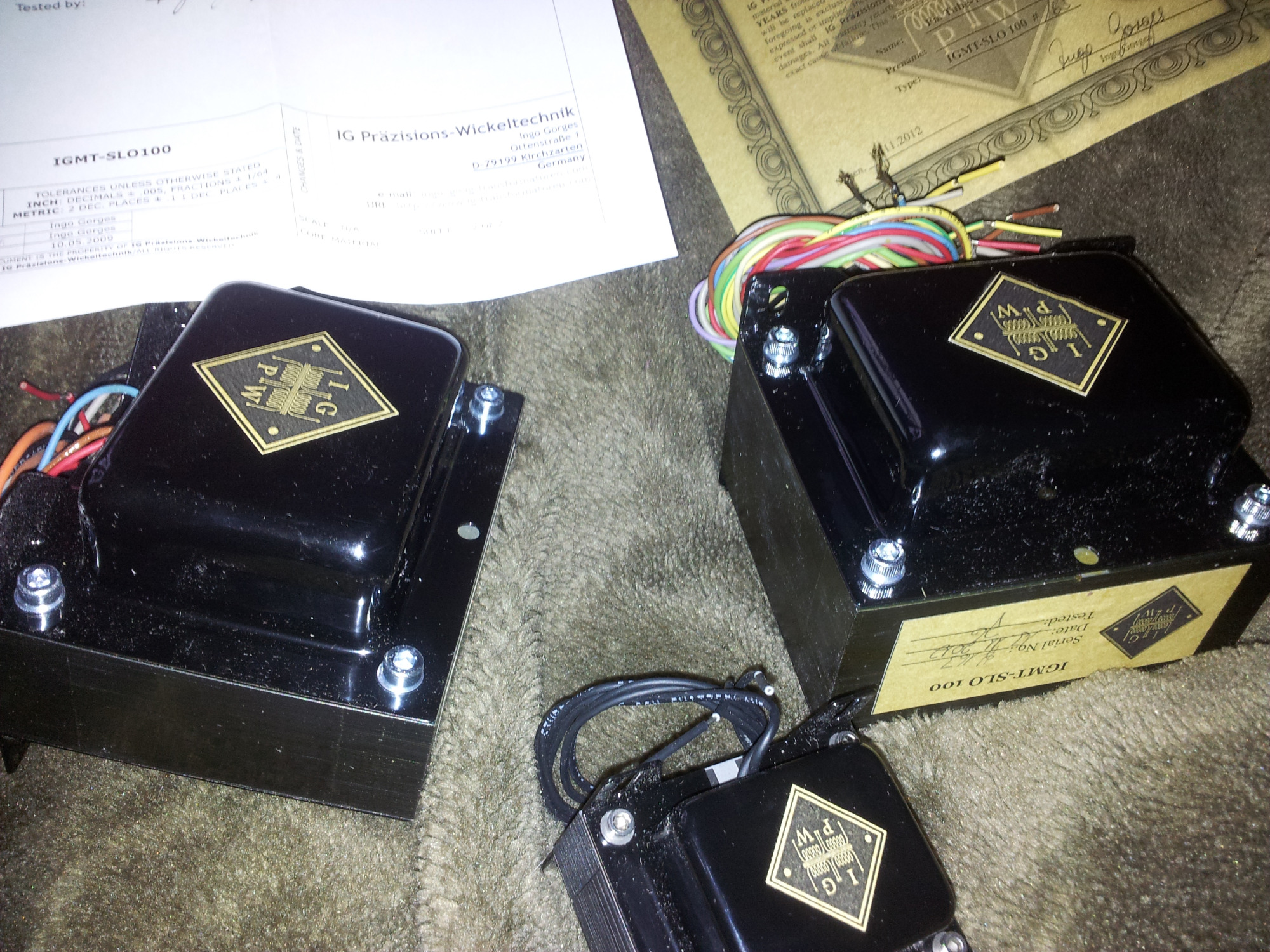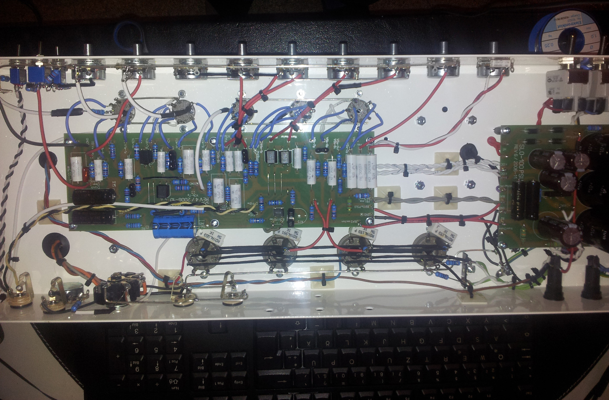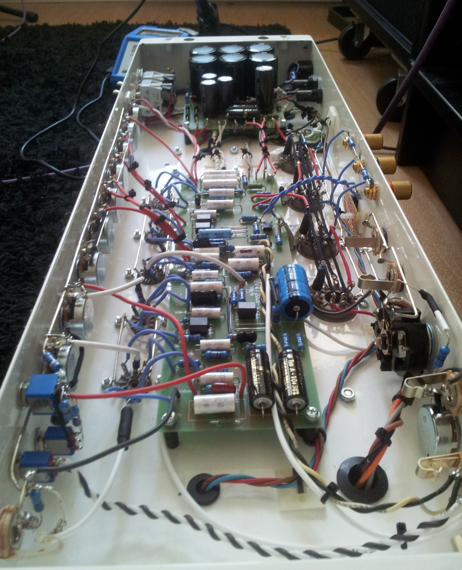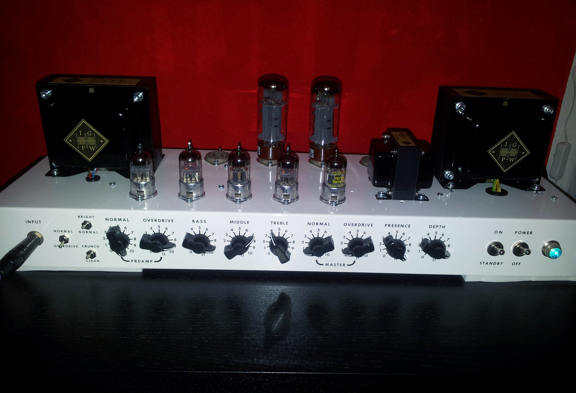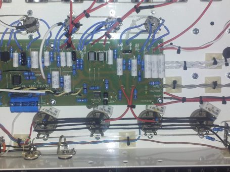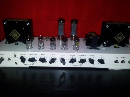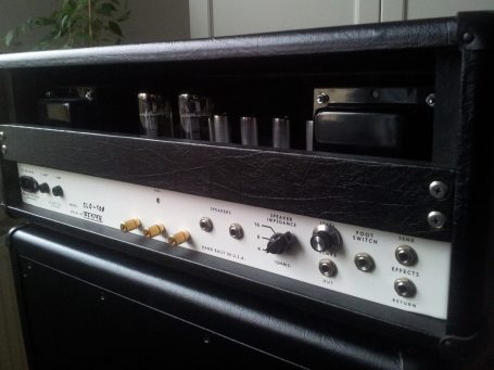 Neben meinen Eigenentwicklungen habe ich auch Nachbauten bekannter Verstärker angefertigt. Dieses Projekt stellt jedoch ein besonderes Highlight dar, da viele der Bauteile exklusiv für das Projekt hergestellt wurden. Das Chassis wurde aus den USA importiert, die Trafos wurden in Deutschland von Ingo auf alten Meteor-Wickelmaschinen gefertigt. Das Gehäuse habe ich selbst mit Tolex bezogen.