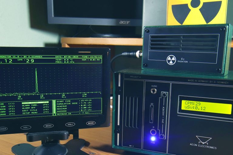 Dieses Gerät ist die nunmehr 3. Generation meiner selbstentwickelten Geigerzähler. In ihrer vollen Ausbaustufe ermöglicht sie, neben dem Datenlogging und der Visualisierung, auch die Messung von Temperatur, Luftdruck und relativer Feuchtigkeit. Alles ist via Infrarot fernsteuerbar, aber auch regulär via Tastatur oder serieller PC-Verbindung. Zudem können auch "Screenshots" auf SD-Karte gespeichert werden. Ein Audioalarm steht beim Überschreiten der vorher definierten Auslöseschwelle ebenfalls zur Verfügung.